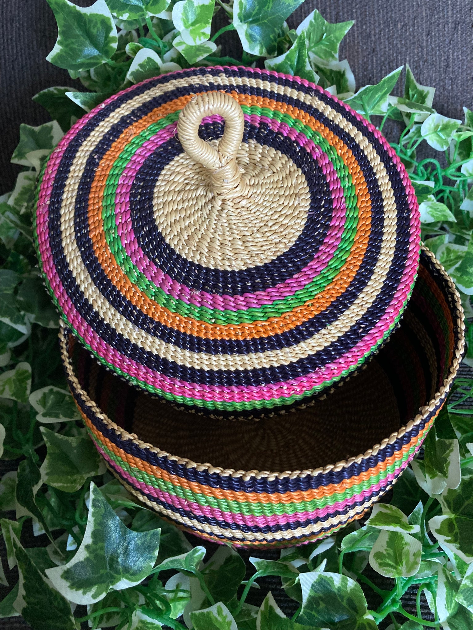 Handcrafted by skilled artisans in Ghana, West Africa. Made with natural grasses and organic dyes. Perfect for storing small essentials: keys, cash, jewelry, even place a small plant inside. Get creative!