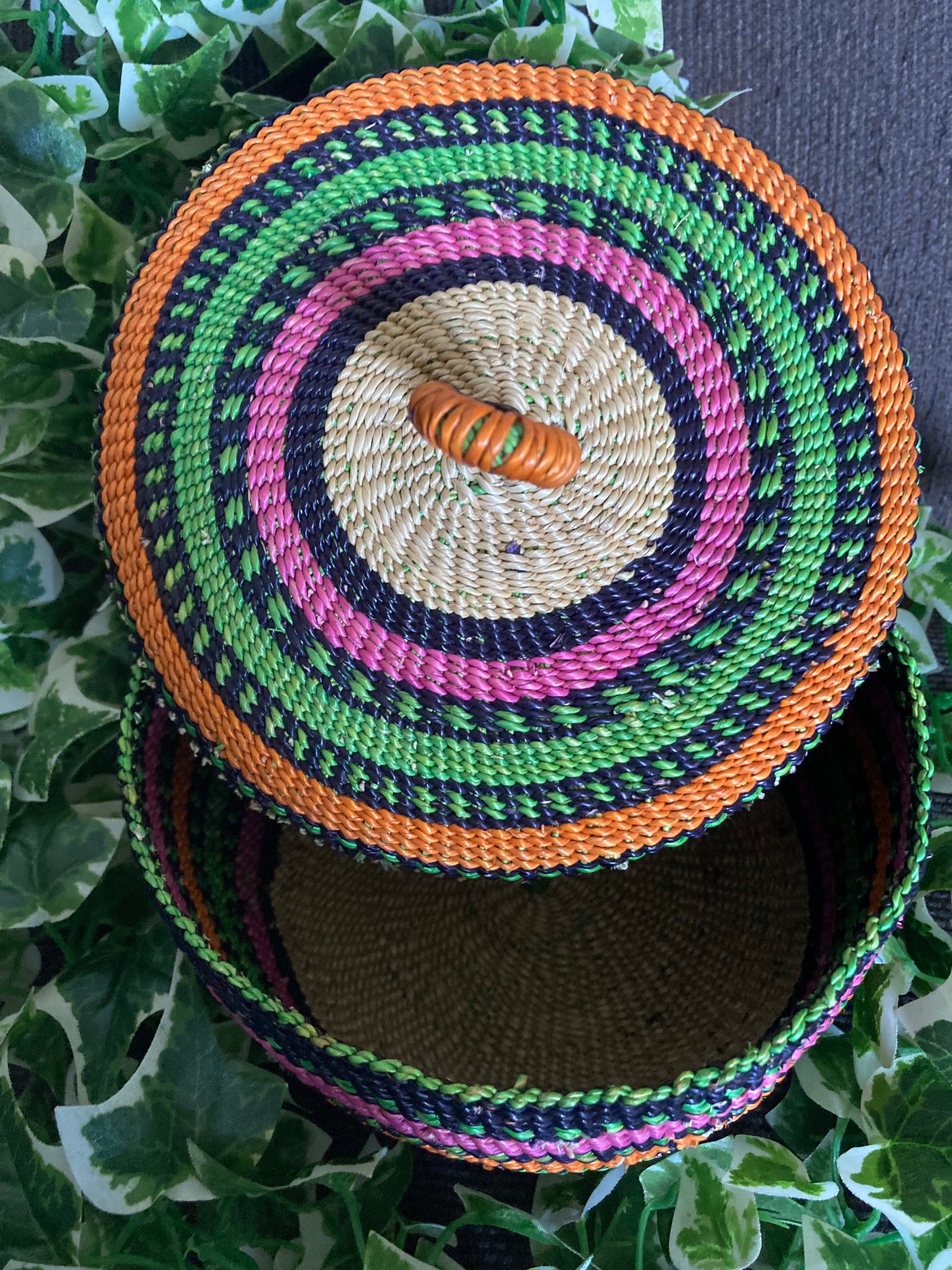 Handcrafted by skilled artisans in Ghana, West Africa. Made with natural grasses and organic dyes. Perfect for storing small essentials: keys, cash, jewelry, even place a small plant inside. Get creative!