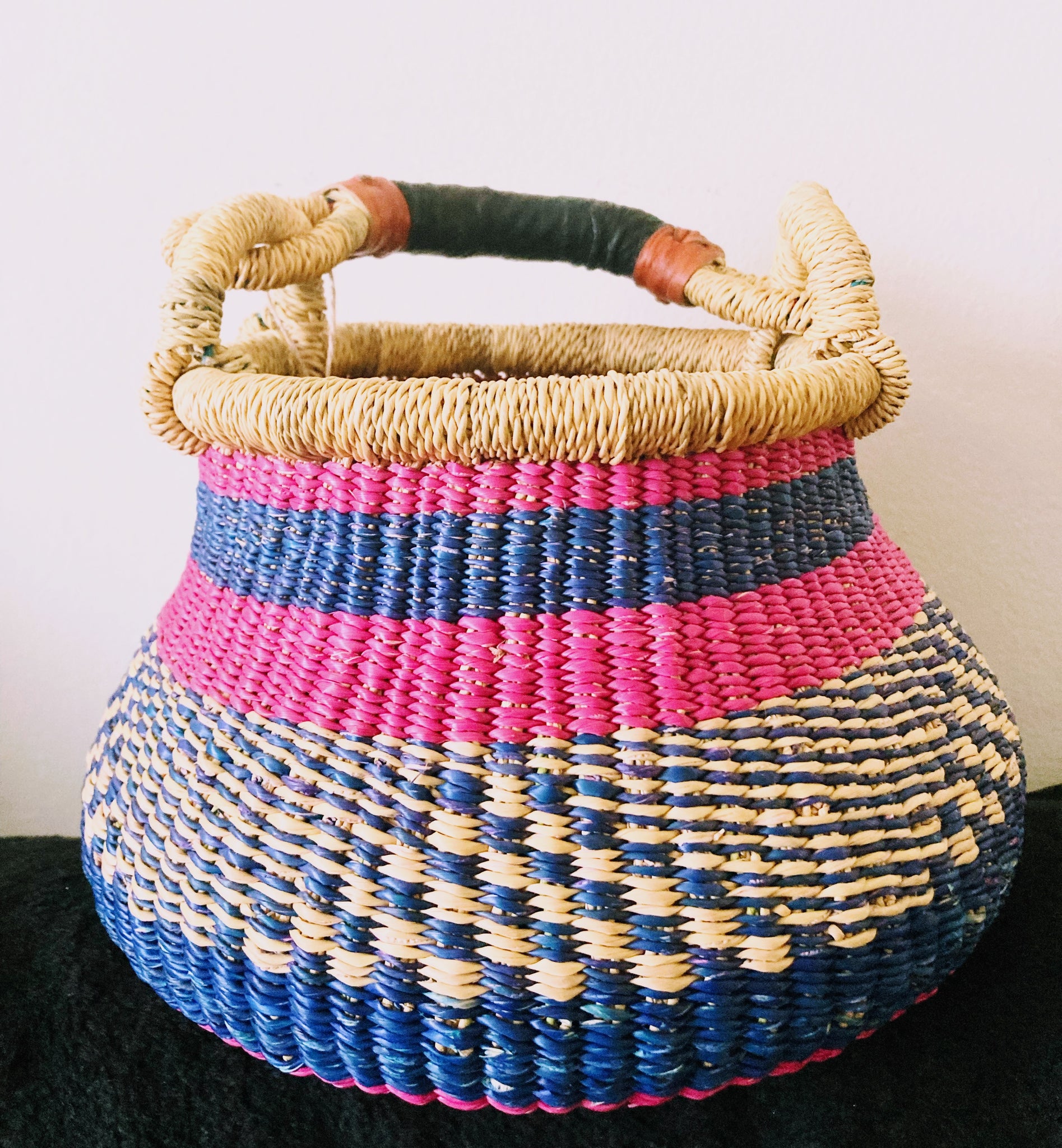 Handwoven basket made artisans in Ghana. Made with natural fibers (elephant grass), wrapped leather handle. Use for storage, shopping, or as a decorative piece.
