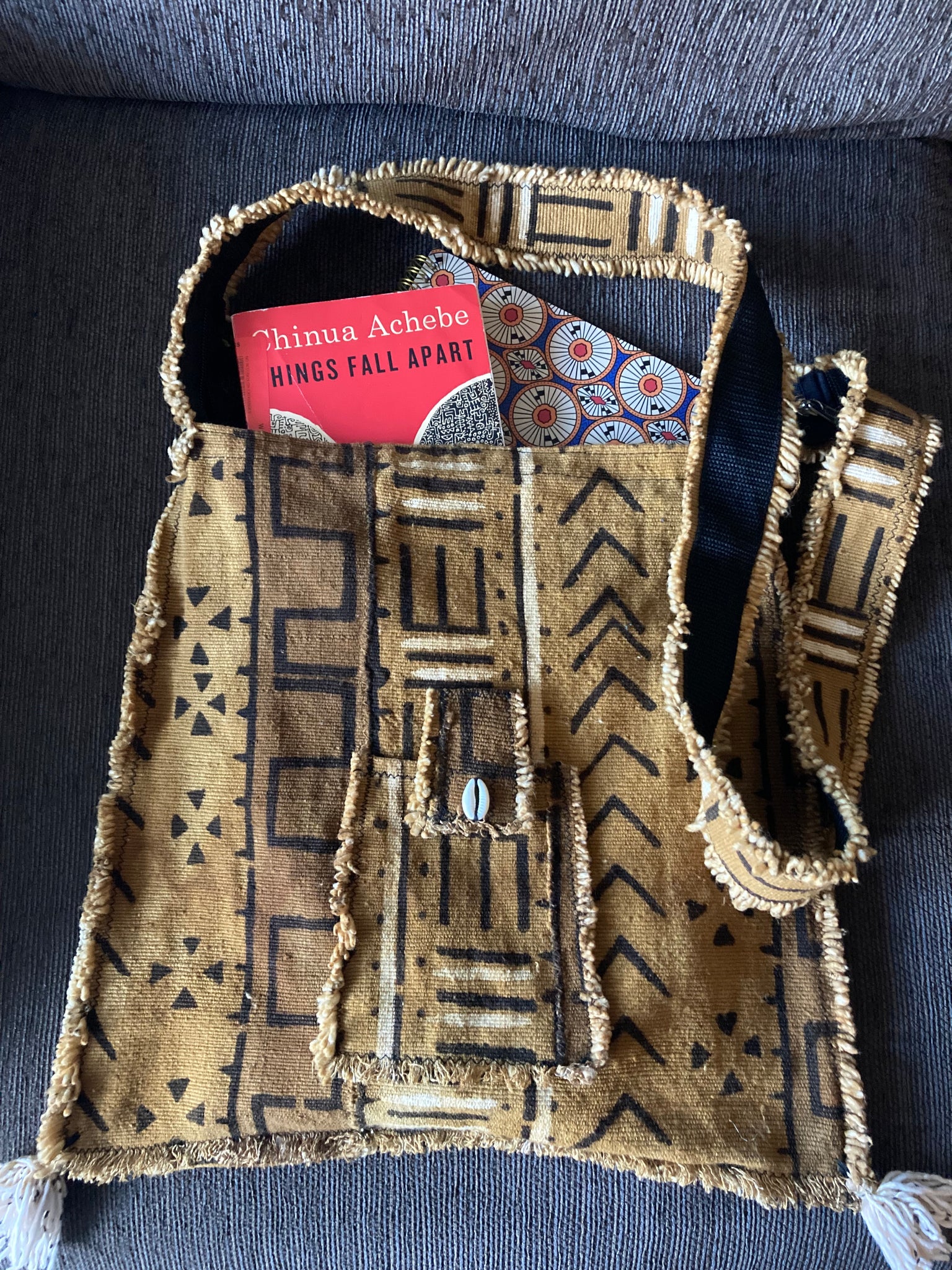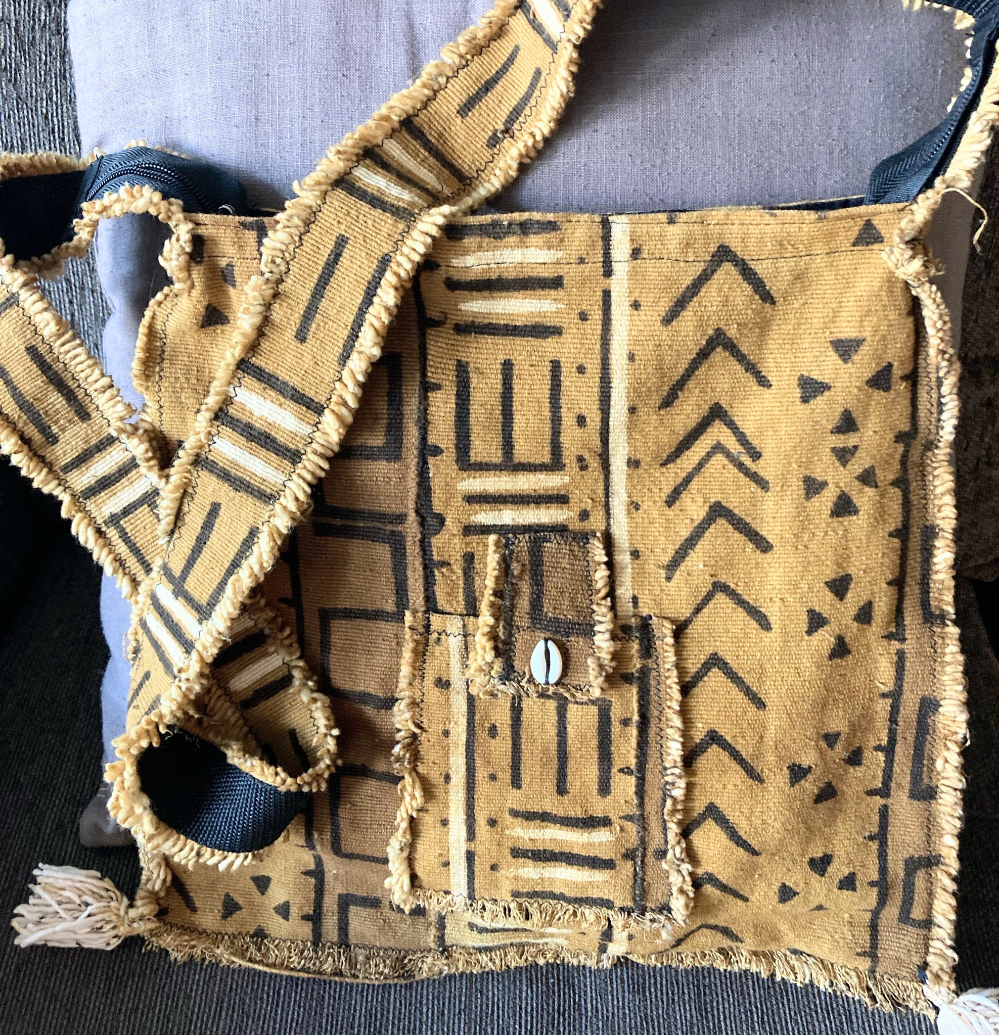 Mudcloth is a labor-intensive material with roots in Mali, West Africa. Organic dyes and fermented mud are used to create beautiful designs. The cotton strips are handwoven and sewn together. Mudcloth comes in a wide range of colors. This bag is golden yellow, black, and white. Lined with zipper and small exterior cowrie shell pocket. Fits a journal, a novel, and smaller lightweight essentials.