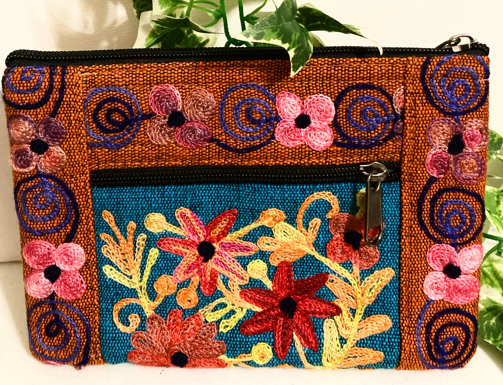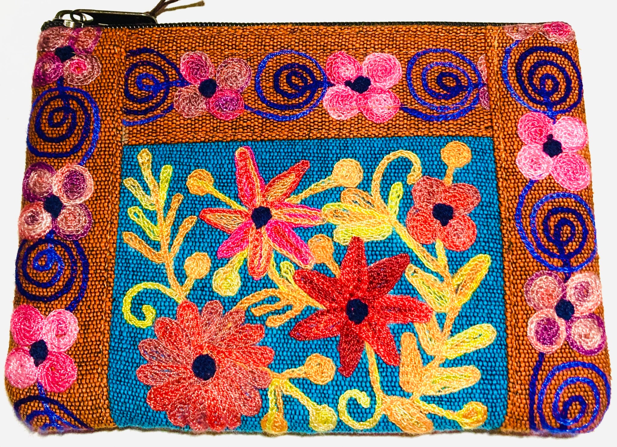 These colorful purses are hand-embroidered with a floral design and lined with reclaimed sari fabric. In addition to the main zippered compartment, there is a 5-inch-wide zippered pocket on the front. They are the perfect size to hold a few travel essentials or phone/wallet for an evening out.
