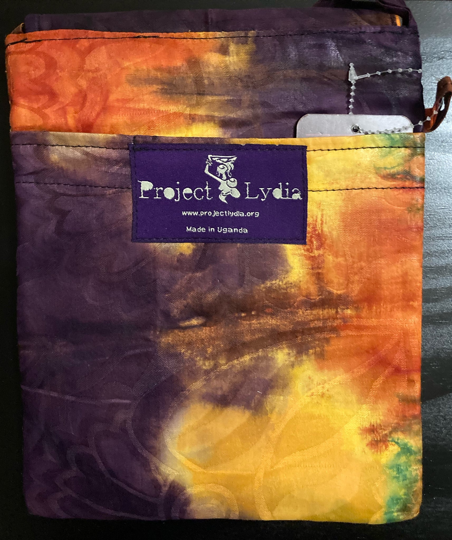 This bag has a fold-over flap and a pocket in the front. Each bag is one of a kind in color variation. The fabric is hand-dyed African batik and is lined with a durable print fabric. All ages love this fun, colorful little bag!