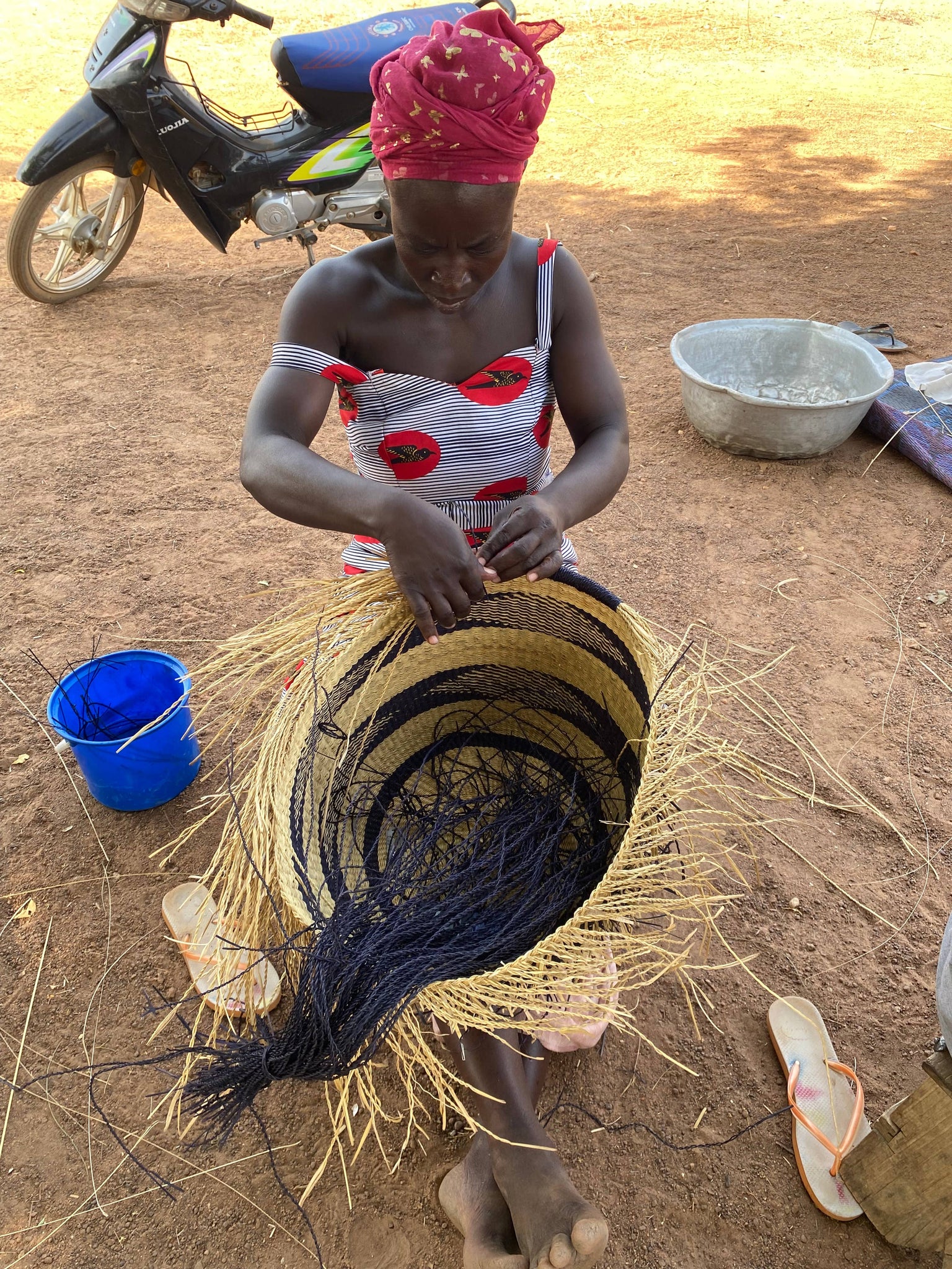 Dimensions: Large: depth 11”-13”; diameter 16”-18” Materials: vetiver grass, leather