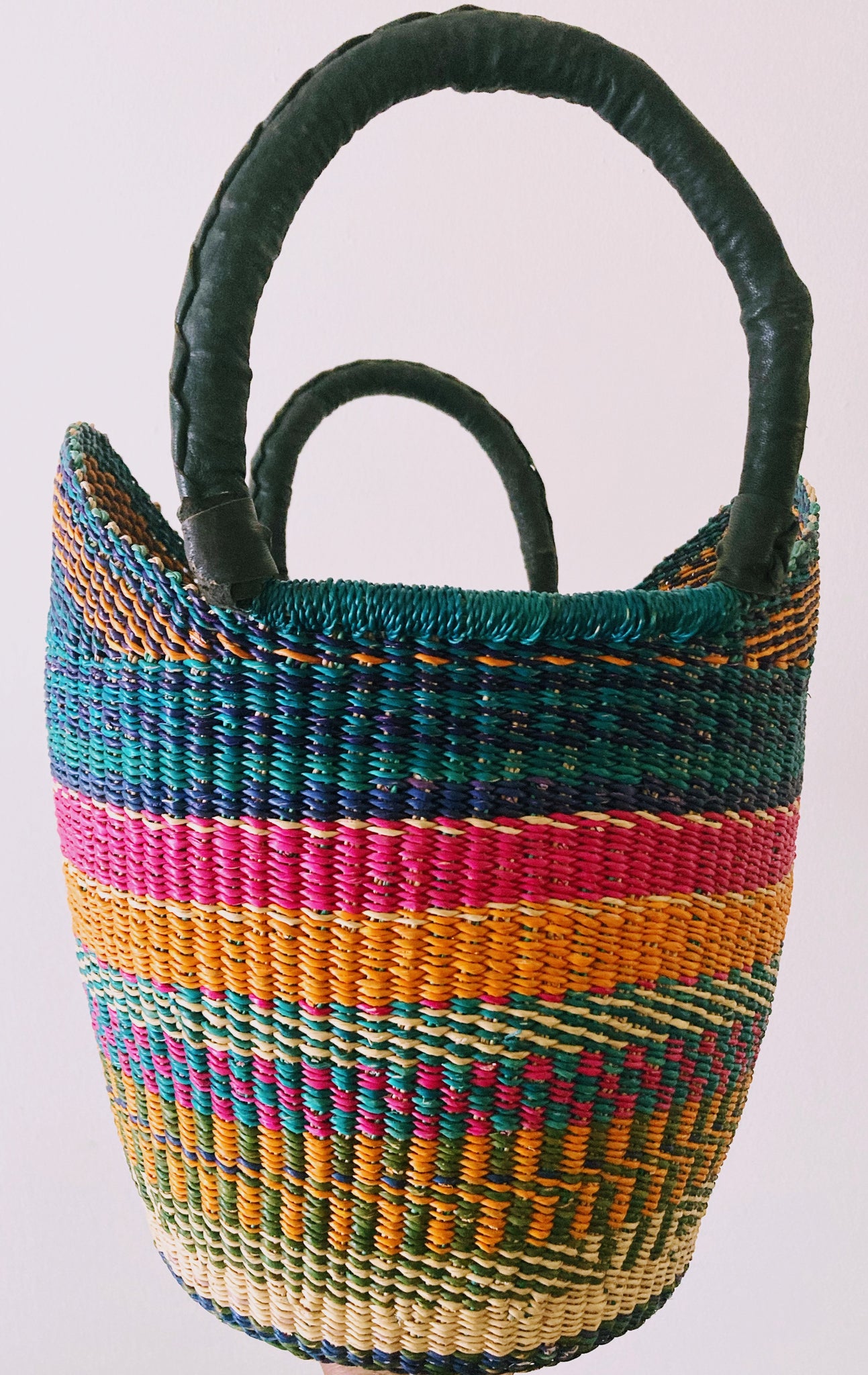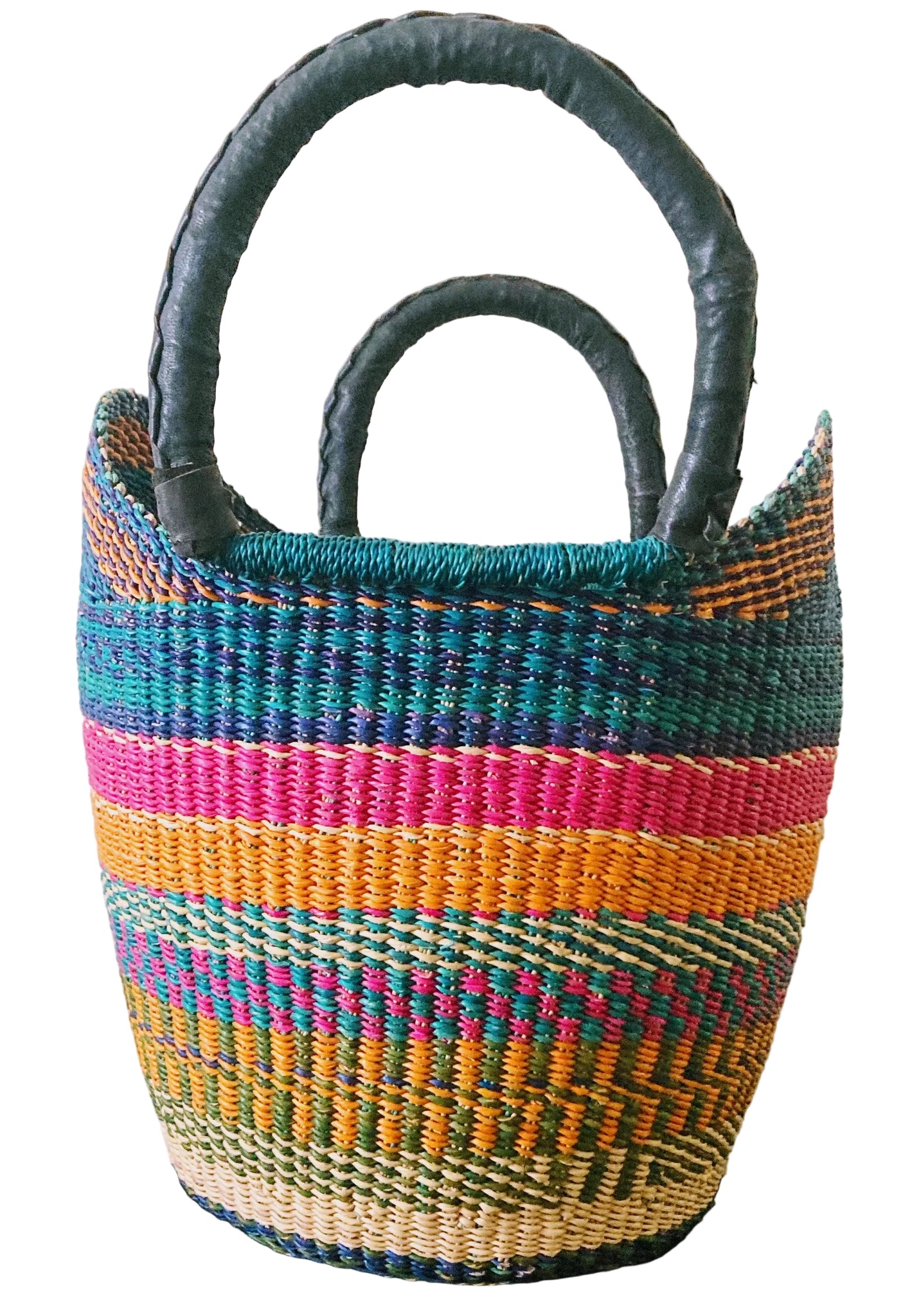 Handwoven by artisans in Ghana. Made with elephant grass, wrapped leather handles.