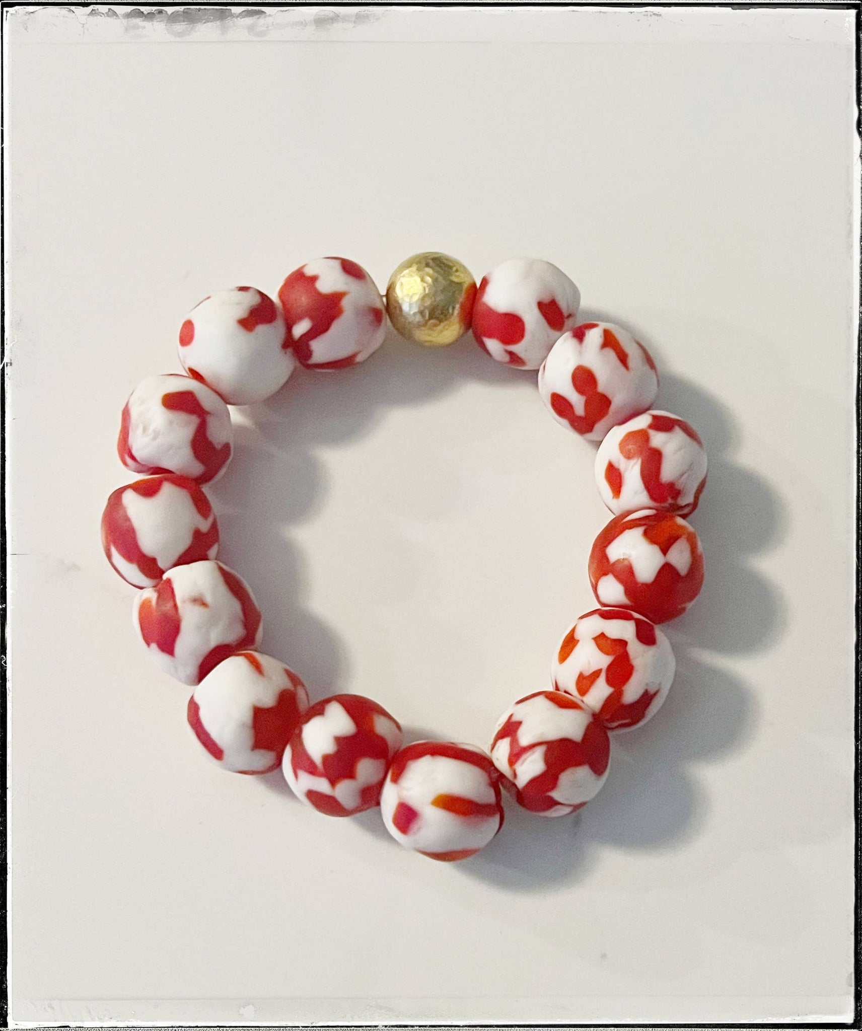 Red & White Recycled Glass Bead Stretch Bracelet Brass: 7”