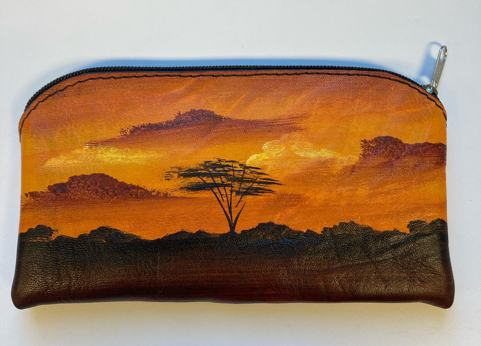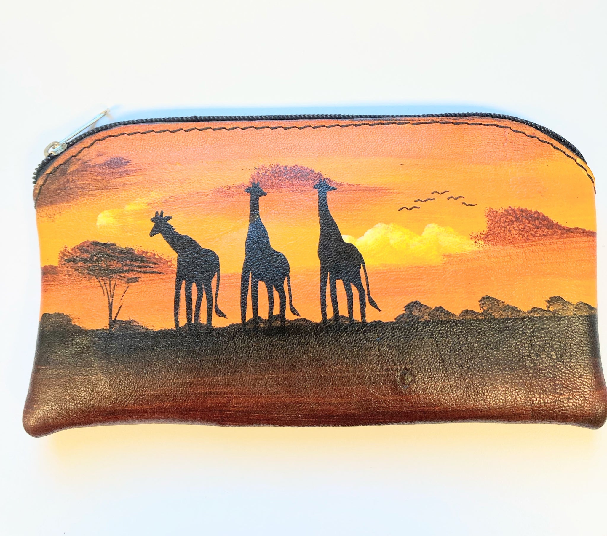 Hand painted purse featuring scenes from Kenya.