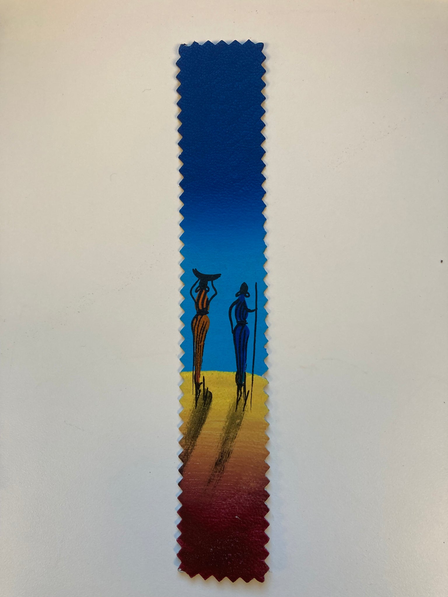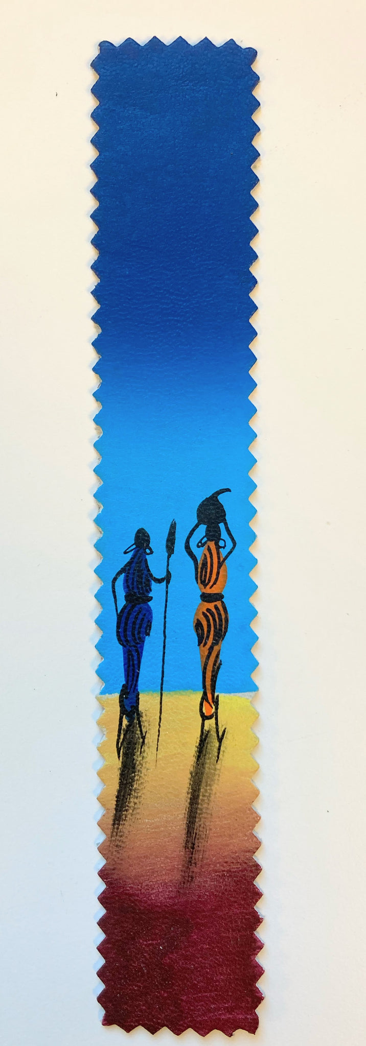 Hand painted bookmark capturing scenes from Kenya. Each bookmark has a slightly different design. Painted on a faux leather surface.