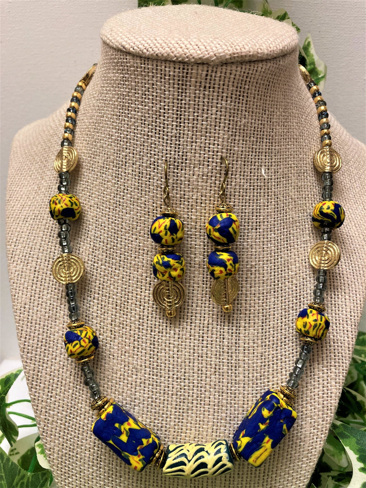 "Krobo" beads are made in Ghana, West Africa. Glass is recycled, crushed into a powder, placed into molds, and fired at high temperatures to create these bold designs. This necklace is made with Krobo beads, gold spacer beads, and black seed beads.