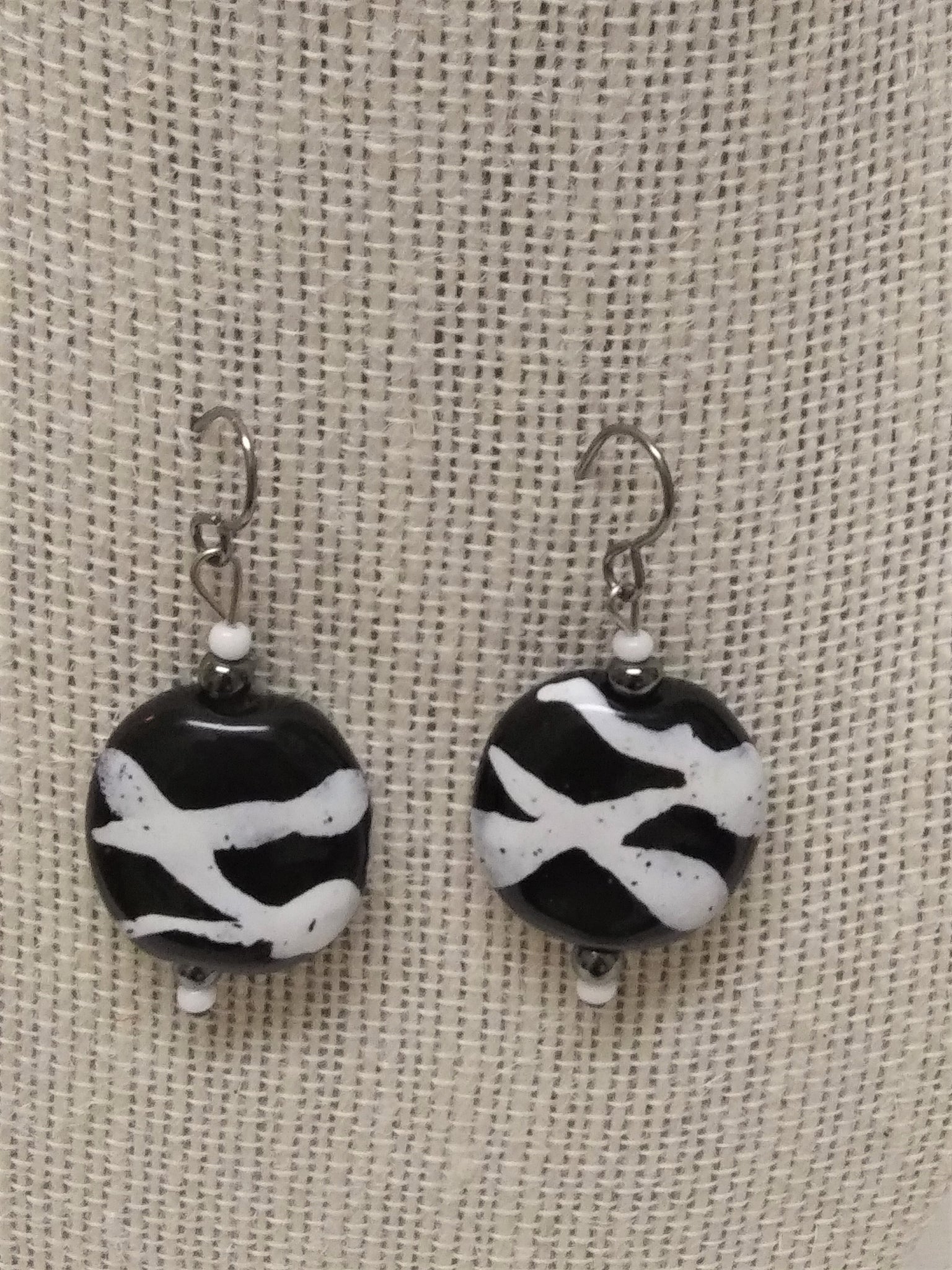 This set was made by "Ronny G" using ceramic beads handmade by artisans in Kenya; black and white seed beads accent both ends of the earrings.