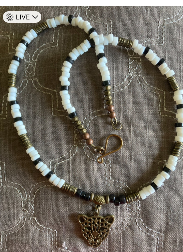22” necklace made with Indonesian recycled glass beads, brass spacers, and alloy pendant
